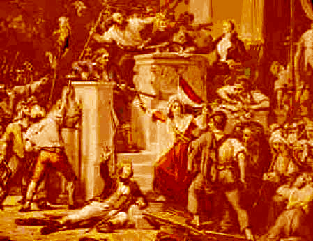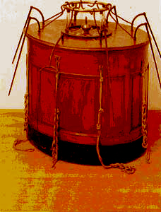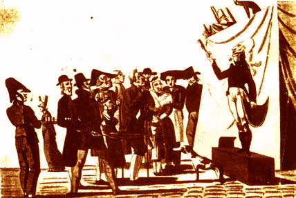 Mesmer in action. He used a baquet (above right) filled with iron filings and from which iron rods protruded and were held by his patients who went into a crisis when he pranced around them. They were then calmed by Mesmer (above left). Abbe Faria argued that these practices were all useless and that all depended on the patient's imagination and willingness to cooperate with the hypnotist. |
